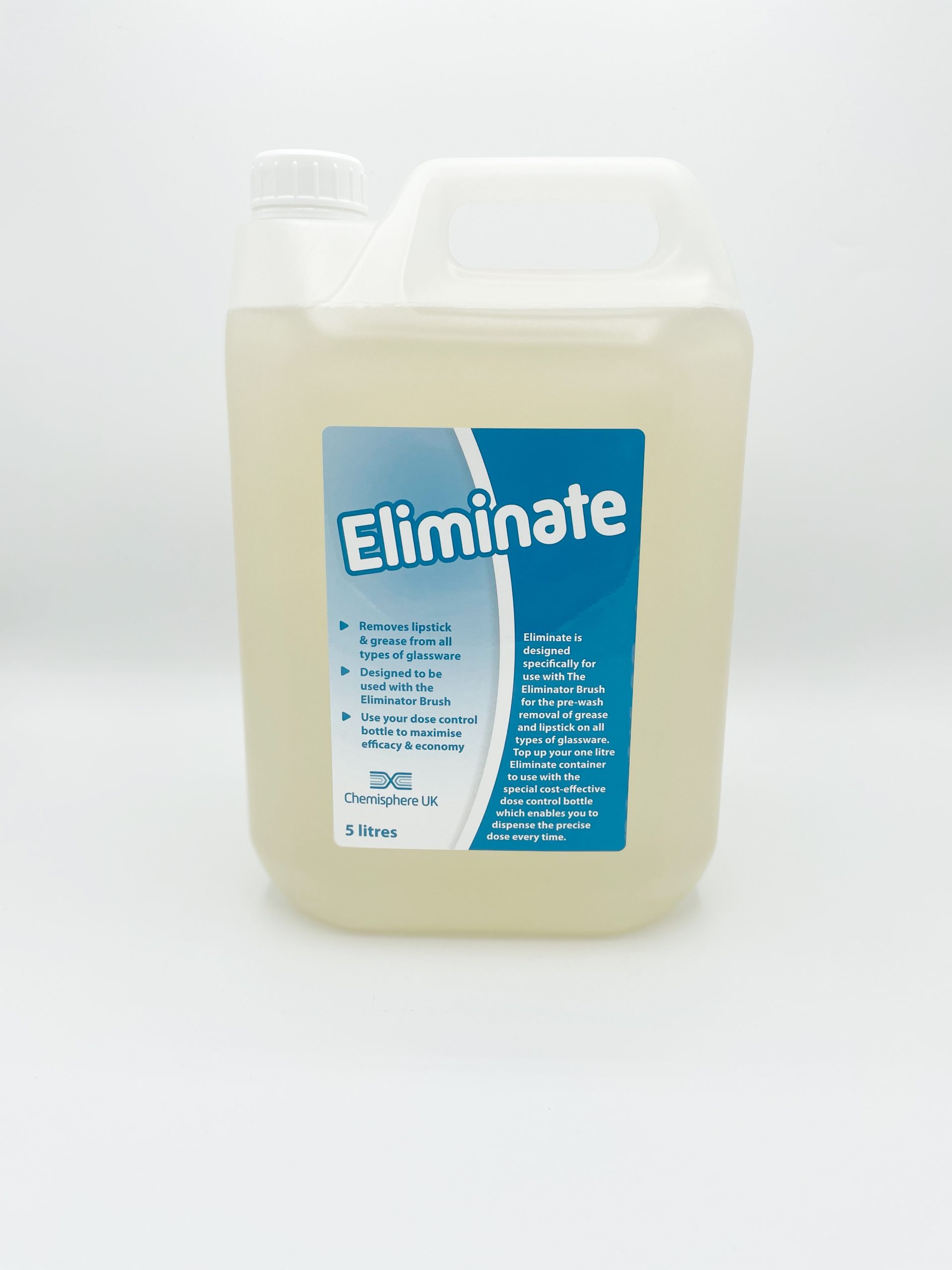Supplied with a special cost-effective dose control cap which enables you to dispense the precise dose every time into Eliminator bowl /brush. This newly improved product is the perfect solution to lipstick stains and grease build-up on your glassware, tackling the problem of hard to remove stains that machine washing alone may struggle to remove. Eliminate will sterilise and remove any bacteria and biofilm benefiting any pub, club or bar wishing to serve drinks, safe in the knowledge that their glassware is clean.